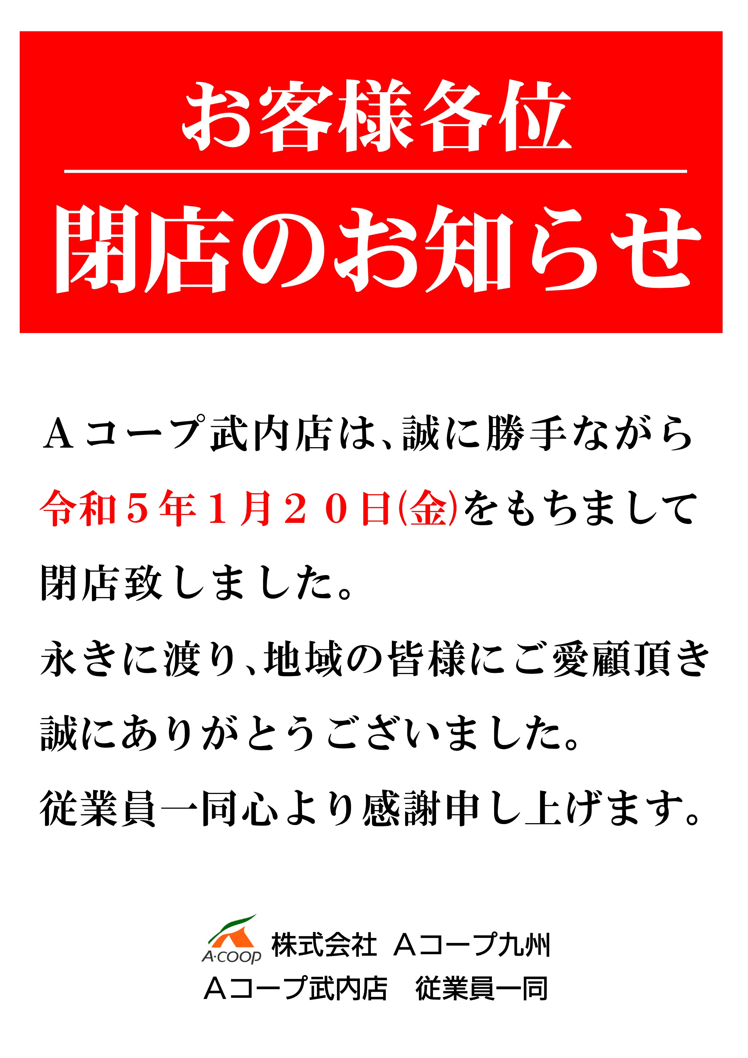 ホーム閉店情報スーパーマーケット1月20日(金)Aコープ武内店が閉店! 2023/01/23本ページはプロモーションが含まれております スポンサーリンク 目次 表示 Aコープ武内店閉店速報 こちらも読まれています! 目次へAコープ武内店閉店速報 店舗名Aコープ武内店閉店日2023年1月20日(金)営業時間–住所佐賀県武雄市武内町22970住所公式サイトはこちらこちらも読まれています!チラシ見放題アプリ厳選2選を徹底比較! コメントを残すメールアドレスが公開されることはありません。 ※ が付いている欄は必須項目ですコメント ※名前 メール サイト Δ