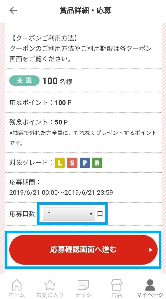 ④ポイントを多く持っていれば、その分応募も多くできます。「応募口数」を選んだら「応募確認画面へ進む」を押します。