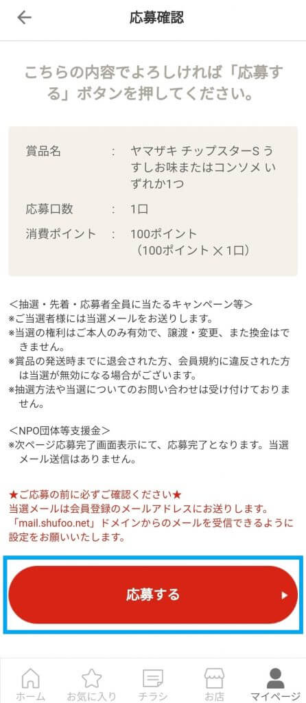 ちなみに、今回わたしが応募した商品は「応募翌日13時頃からマイページ」で発表&確認できます。