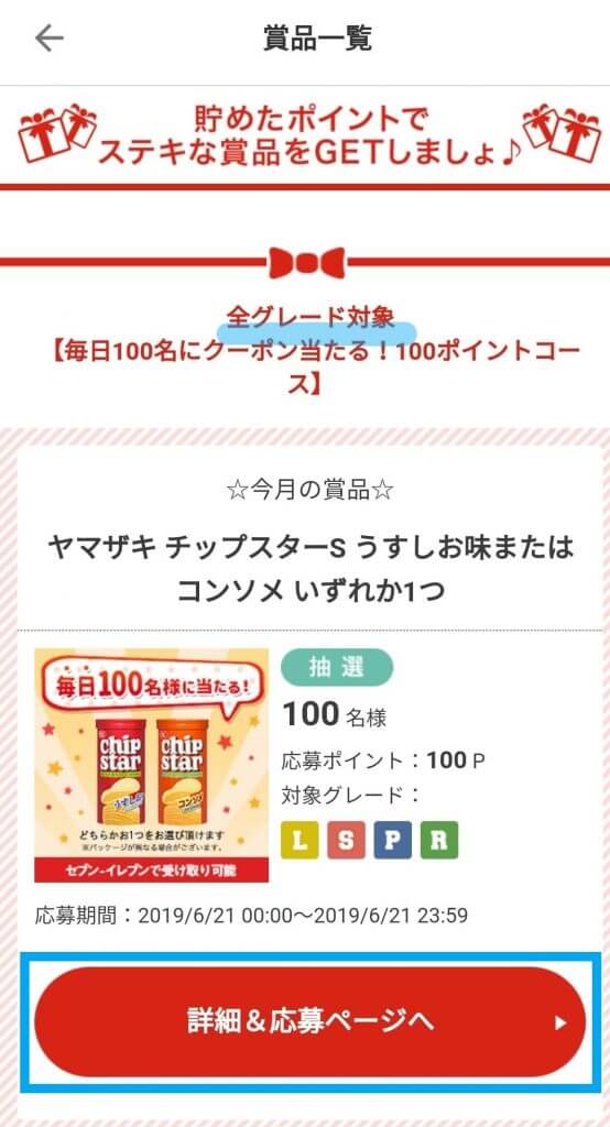 ③応募したい賞品の下にある「詳細&応募ページへ」を押します。賞品はグレードによって分かれているので、水色の下線を引いた箇所で確認してください。